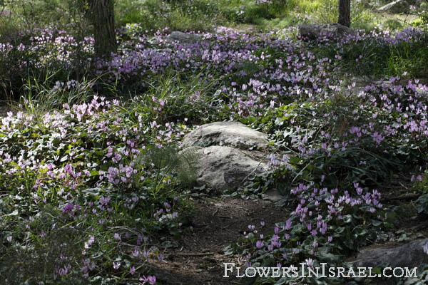 Location: Road 3415, Gad Hills (Givad Gad) Derivation of the botanical name: Cyclamen, Greek, kyklaminos, kyklaminon used by Dioscorides and Theophrastus, possibly from kyklos "cirkle, round, ring, circular, globe," referring to the shape of the leaf or to the rounded tubers; Latin cuclaminos, cyclaminon (Plinius) for the plant sowbread. persicum, of Persia. The Hebrew name: רקפת, Rakefet, after the Syrian name Rakafta.