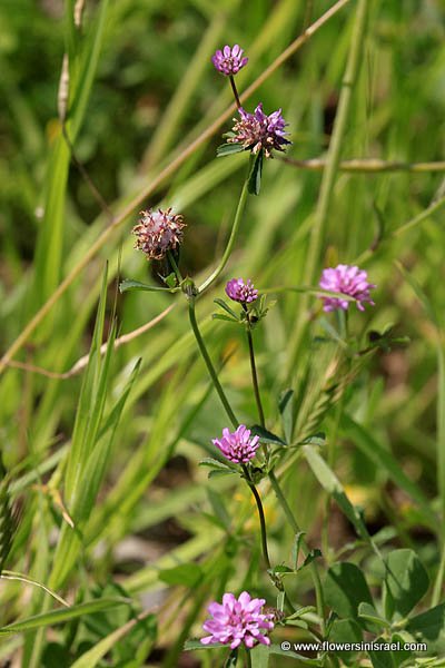 Derivation of the botanical name: Trifolium, Latin tri, tres, three; folium, leaf; three-leaved. glanduliferum, bearing little glands. nervulosum, with little veins The Hebrew name: תלתן, taltan, clover, trefoil, from tlat (Aramaic) three; the clover is recalled in the Mishnah Kilayim 2:5, "[a field} of clover among which grew up..."