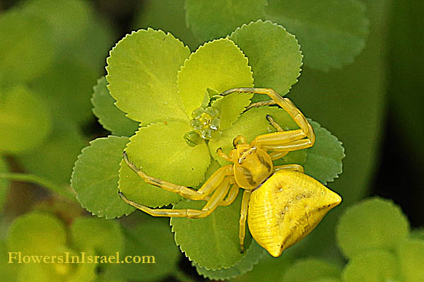 Yellow Flower Crab Spider Euphorbia helioscopia,Sun spurge, Wartwort, Cat's milk, חלבלוב השמש